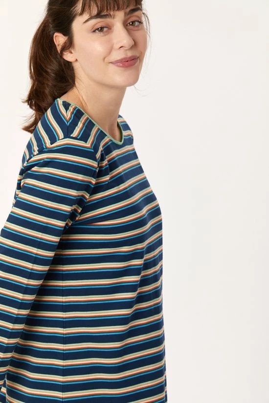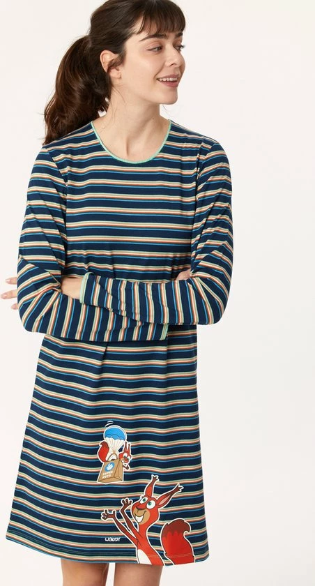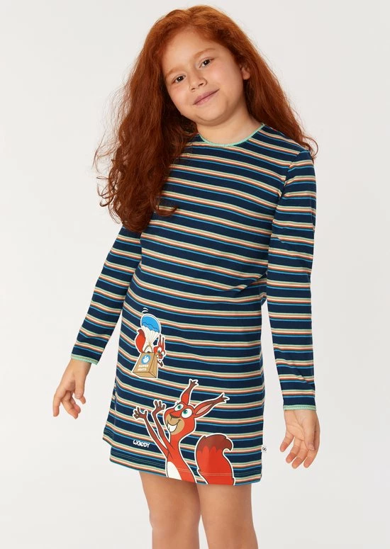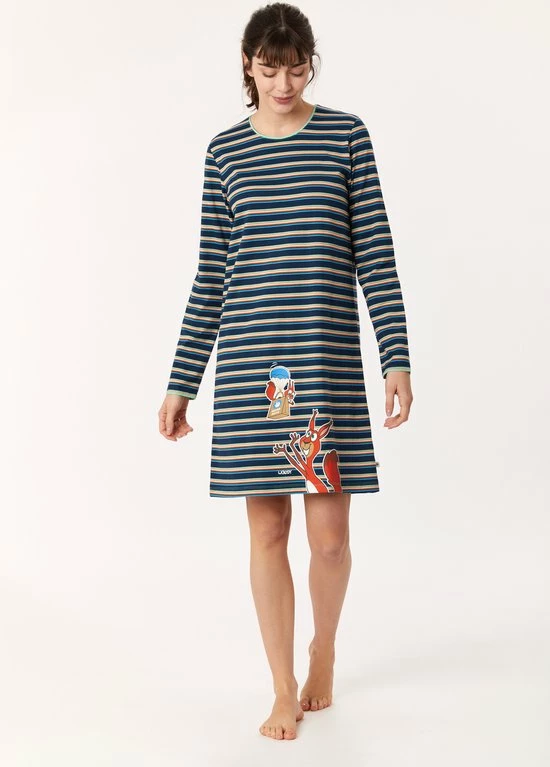 Slaapkleedje van zacht gestreept katoen, met een grote, speelse print van de Woody eekhoorn. Dit slaapkleedje heeft een normale pasvorm, met lange mouwen en een lengte tot boven de knie. Hierdoor zit dit gemakkelijk en comfortabel.