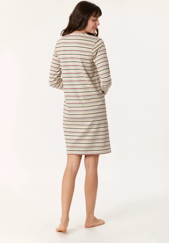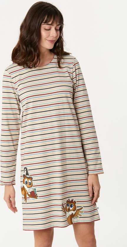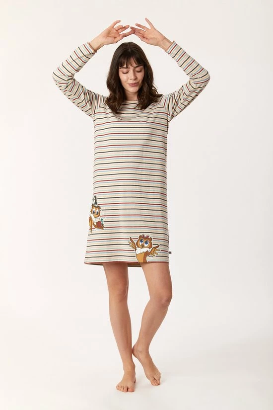 Slaapkleedje van zacht gestreept katoen, met een grote, speelse print van de Woody uil. Dit slaapkleedje heeft een normale pasvorm, met lange mouwen en een lengte tot boven de knie. Hierdoor zit dit gemakkelijk en comfortabel.