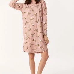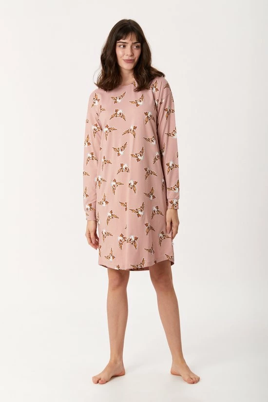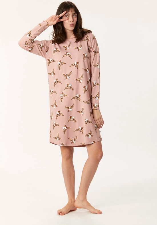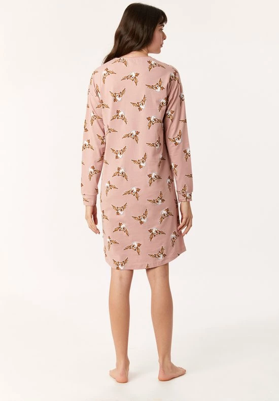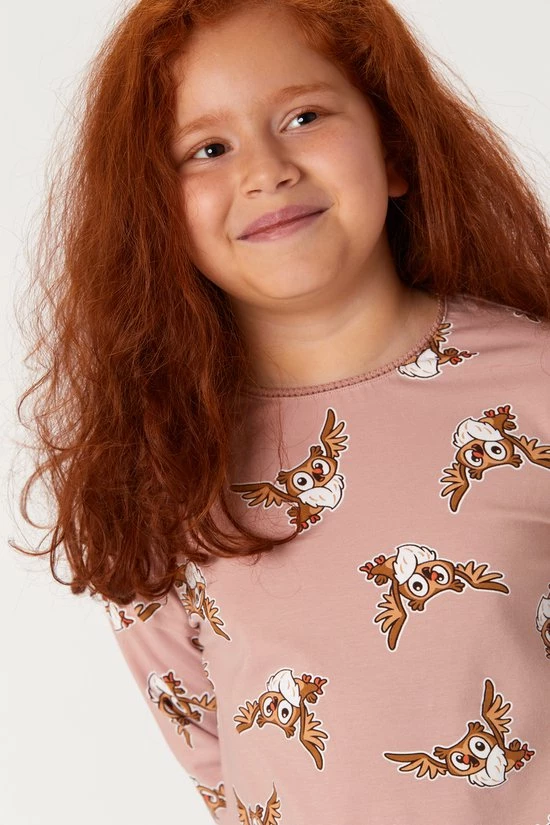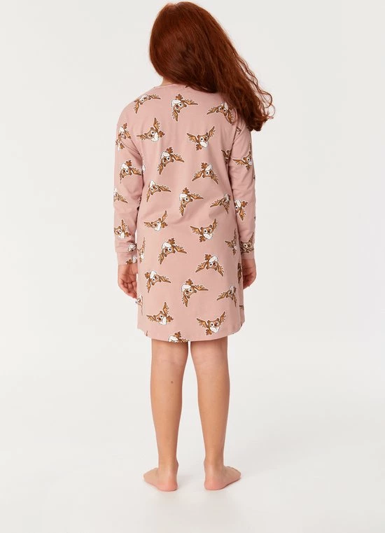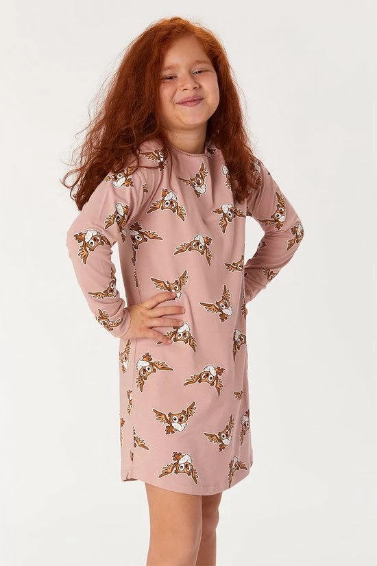 Woody slaapkleedje van rekbaar, soepel en zacht katoen, met lange mouwen en lengte tot op de knie. Dit slaapkleedje in oudroze heeft een allover print van de Woody uil. Het draagt heel aangenaam, en is echt een aanrader, voor ieder seizoen, èn het combineert leuk met onze bijpassende Woody winterbotjes.